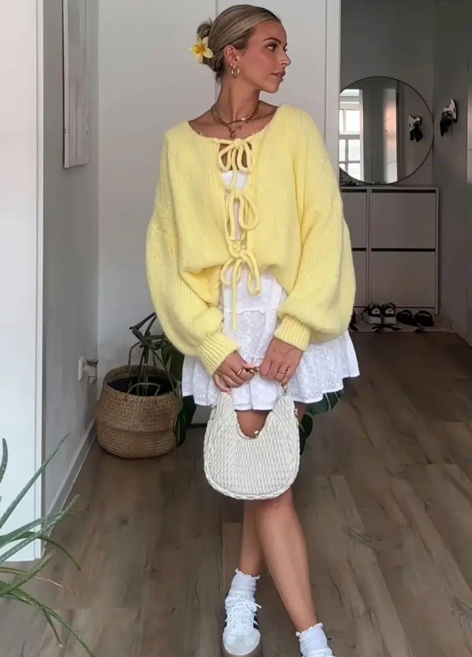 A tie-front lemon knit layered over a white eyelet mini dress creates a soft, romantic, slightly coastal look. This pairing flatters hourglass and pear shapes because the layered cardigan draws attention upward while the mini dress elongates the legs. Perfect for spring dates, brunch, or weekend wandering. Not ideal for very cold weather due to the lightweight nature of the dress.