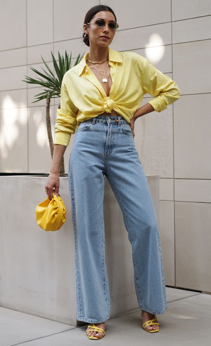 Here, the yellow button-down takes on a fresher, slightly more structured identity. Tied at the waist and paired with wide-leg denim, it channels an updated 90s energy—clean, crisp, and incredibly flattering for those with hourglass or inverted-triangle silhouettes. The look works beautifully for brunches, creative offices, or casual shopping days. It’s the kind of outfit that photographs exceptionally well thanks to its high contrast and modern proportions.