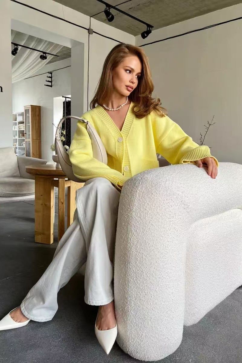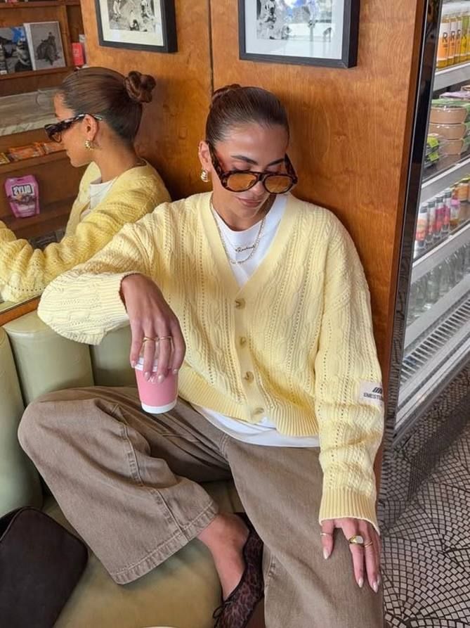 Thick yellow cardigan: tactile, plush, and personality-forward, the kind that feels warm enough for transitional seasons but light enough for layering.