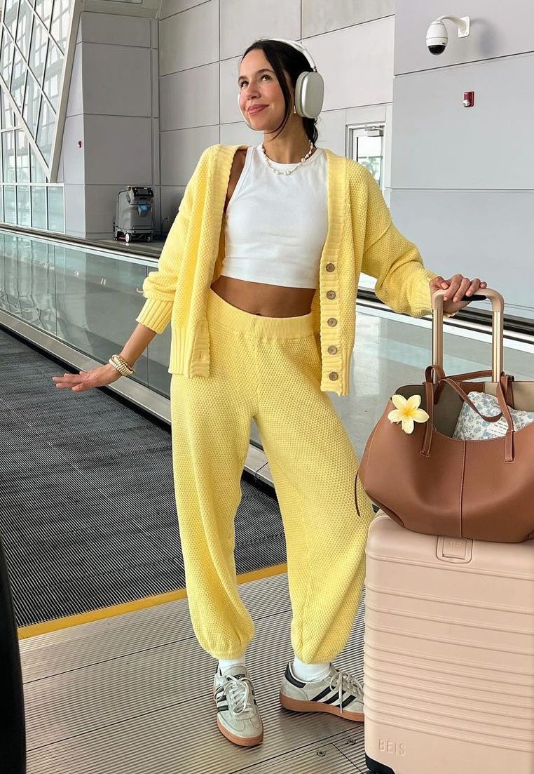 This cozy airport-ready look features a textured matching cardigan and trousers in a beautiful butter yellow. The softness of the knit combined with the cropped white top makes it ideal for travel—it stretches, breathes, and allows easy layering. The set favors straight, athletic, and petite figures thanks to its vertical knit that elongates the body. It’s also practical for long flights or train rides because it retains shape without wrinkling.