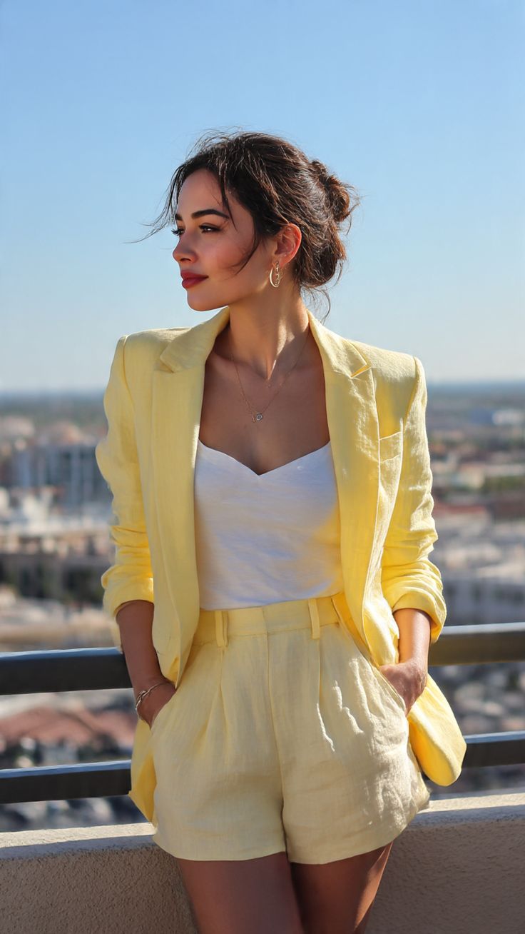 This is the breeziest and most resort-inspired look—perfect for vacations, rooftop lunches, or warm-weather events. The pastel yellow blazer paired with shorts creates a graceful balance of structure and softness. Great for petite and hourglass figures due to the defined waist and elongated leg line.